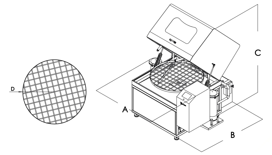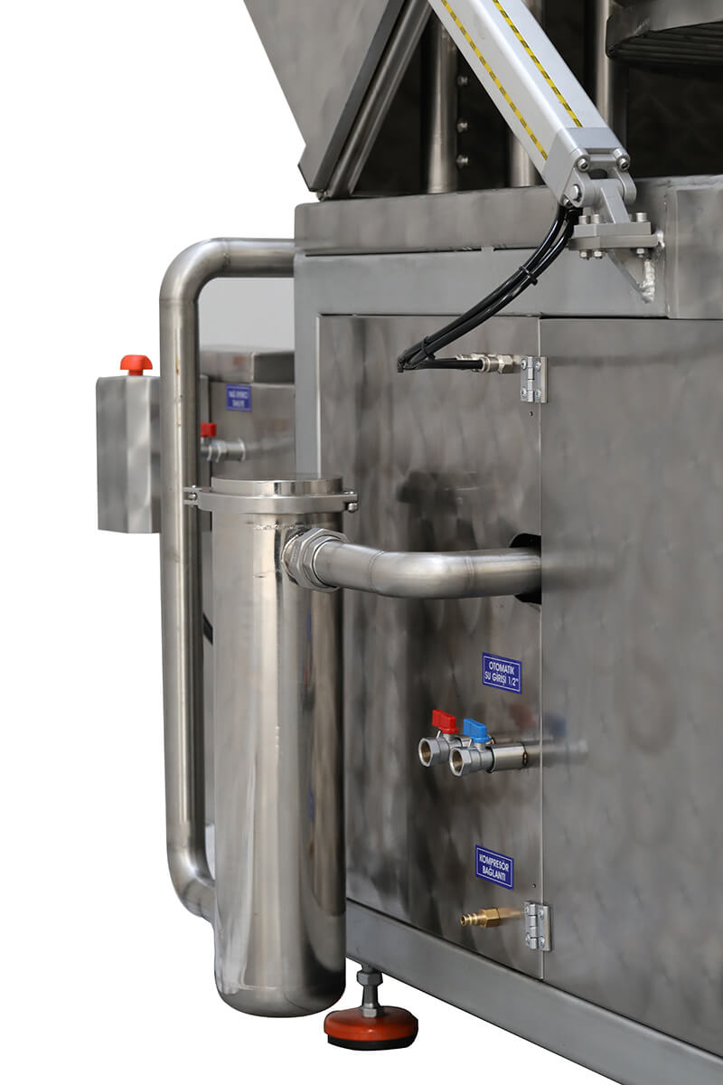 The products placed on the rotary basket are cleaned with high-pressure, detergent-based water inside a closed cabin. Depending on requirements, additional processes such as washing, rinsing, drying units, and precision filtration can be integrated to enhance cleaning quality.