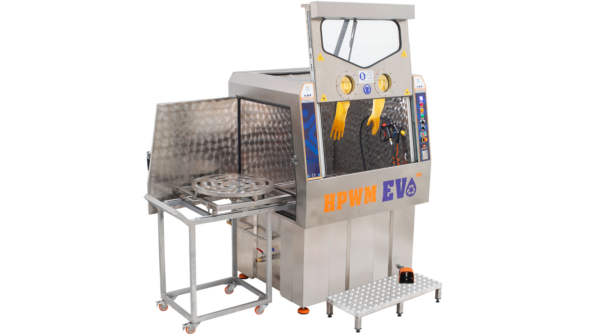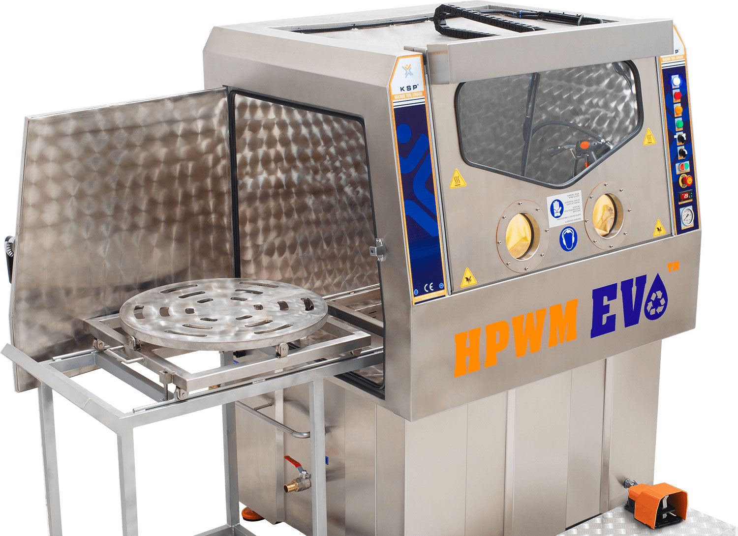 Developed by KSP Machine, the HPWM EVO Series is designed for detailed cleaning of large and complex parts using high-pressure water and brush washing units. Parts placed on the rotary basket are washed manually or automatically, depending on the configuration, ensuring controlled and safe operation for the cleaning of heavy components.